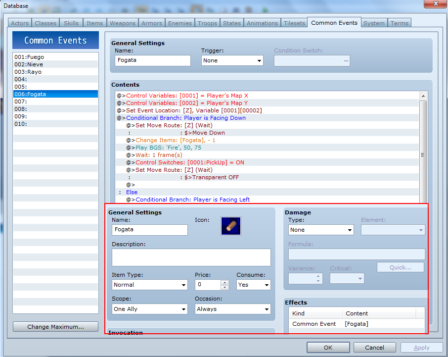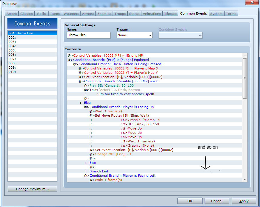 Let me explain: in another project, the character can throw fireballs when pressing Q,I tried to make it so that when you use 'Fire Scroll' then the common event is called, but that didn't worked so I used a common event with a branch condition that if 'MainCharacter' was wielding 'Fire' weapon and pressed Q the event would set an event called 'S' location on top of the character (I wanted to set it in front of it but couldn't figure out how :c ) and then move foward depending on wich way the player was facing: