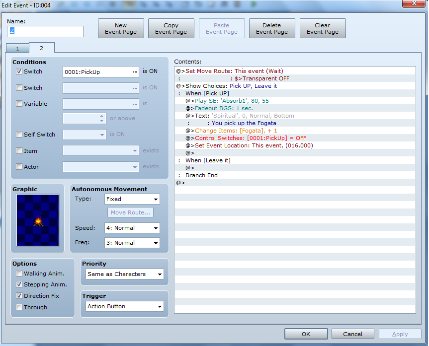 Although I dont know how to set graphic to coordinates depending on Characters location, or make it so that after you place the fireplace you could pick it up again.
