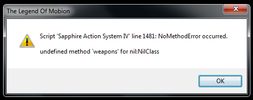 I installed the current version oh Khas Sapphire Action System into a game I am creating, and it starts but after my intro screen I created after hitting new game. It goes black, freezes for a few seconds and then this error pops up.