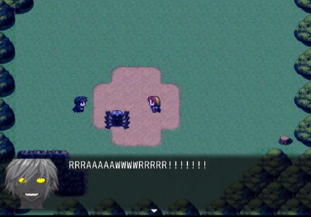 The battle system is standard RTP, which can still be made pretty fun, but I found that Zeeel's battles were just repetitively casting Quake and Claire's battles were just repetitively using escape. I did fight one 2 slime battle and a couple 2 hornet battles, but the battles were so one-sided that it didn't look like I'd need to level up any time soon, so I just ran from them all. I did notice Claire had a sword called Bloodrayne (offputting) until Direk beat her in one hit, then had no weapon at all. There also was no incentive to stay and fight because I almost had a game over from one of the three battles I did fight - the hornets dodged twice and suddenly I was one hit away from death, with only a single healing item in my inventory. After using it, I was knocked back down to half health in the same turn, so it seemed like I would get a game over if I did anything but run.