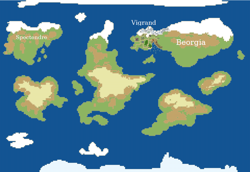 Hugely un-detailed world map, only 3 countries planned have names, this game will only take place in Vigrand. I actually made Vigrand too big too; I don't want a world-encompassing escapade that makes everything feel small, I want Aerth to feel large by making Vigrand smaller, funnily enough. It also should make everything feel more personal. This is the story of one country in a big world, and although it may not seem like a big deal compared to other stories of worlds being devoured by demonic beings, to the characters involved, they're risking everything.