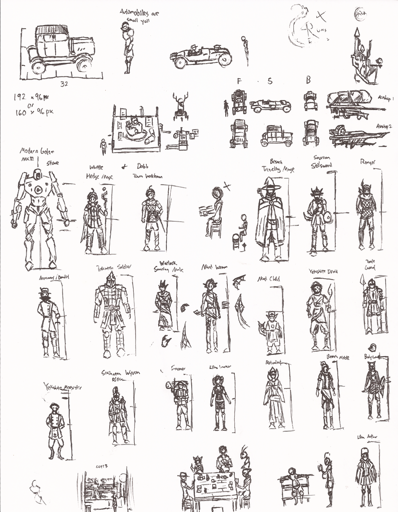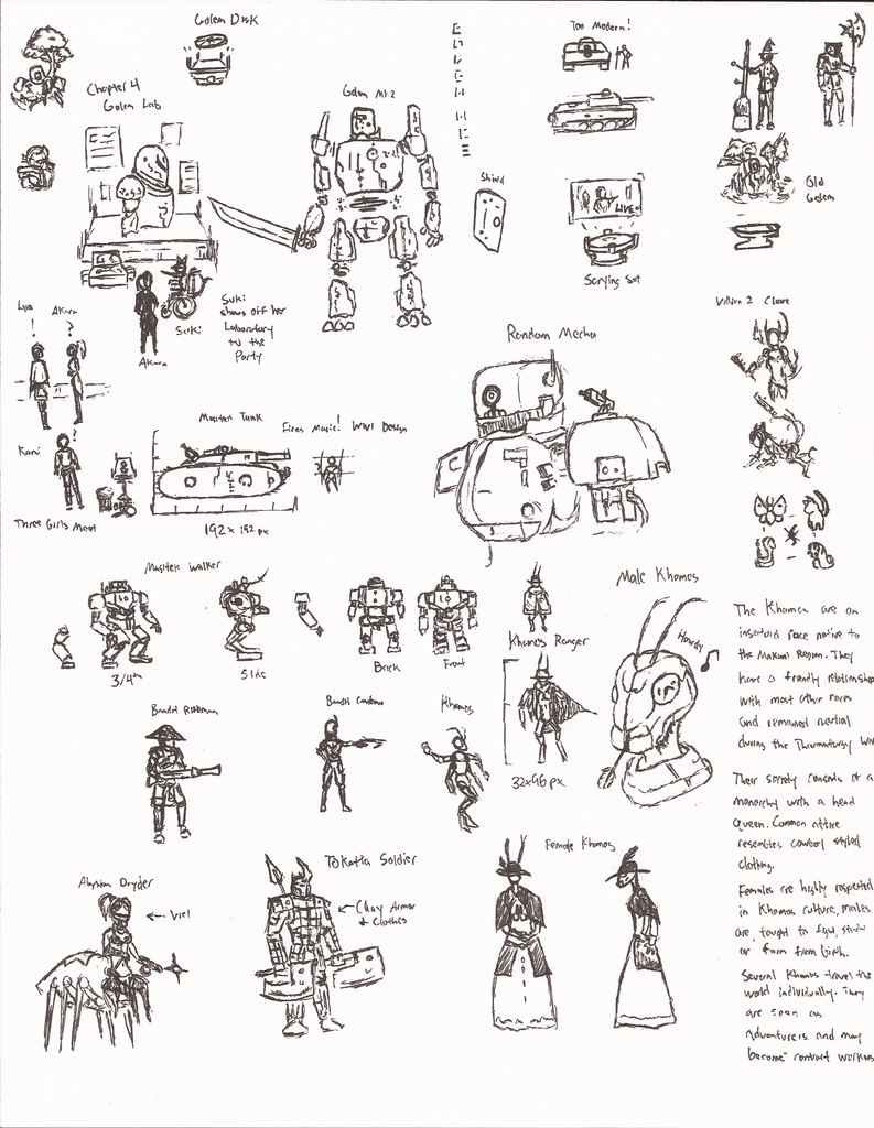 Pen thumbnails for battler ideas, overworld sprites, scenes, lore and tiles. I thought it would be cool to have WW1 styled tanks or Studio Ghibli styled tanks be placed in this setting and have them powered by magical forces. I also went with the idea that the Insectoid Race has a bit of a Cowboy or American Frontier styled fashion and culture. Imagine a Four-Armed insect wielding revolvers in each hand!