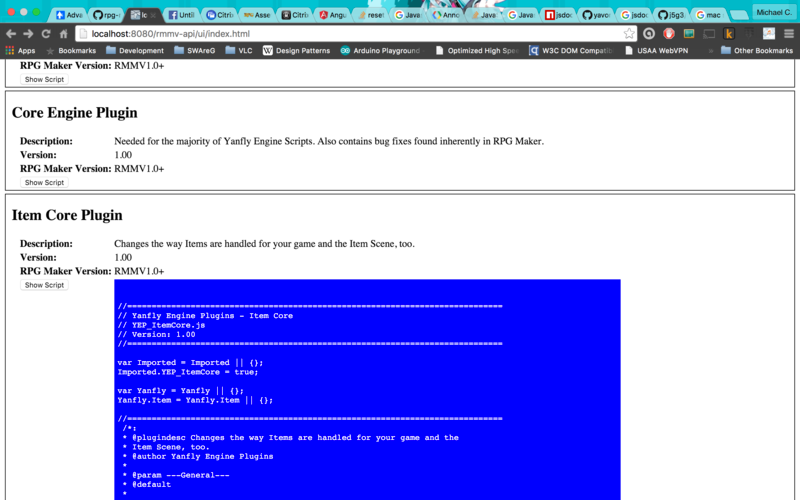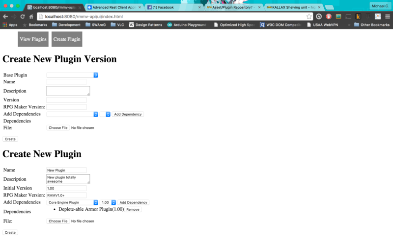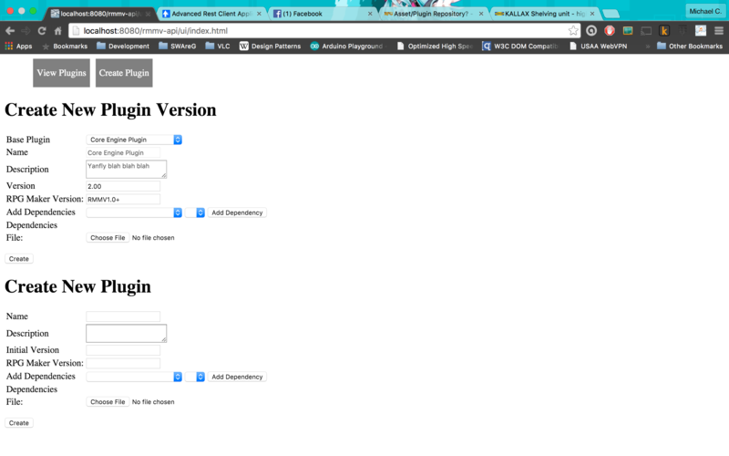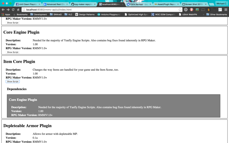 Basically what I want to give the community is a separate application (available for free) that would allow this kind of functionality for RPG Maker Plugins as well as actually telling you if two plugins might conflict with one another. The other portion of the project would be a web service that would sit in front of the repository and allow Plugin Developers to upload new plugins and manage existing ones. A REST API would be provided for other developers to make use of it however they please.