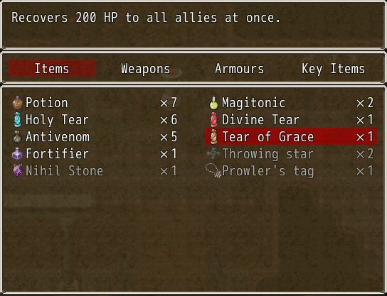 I am starting to have the idea of skills upfront grow on me. The seldom potions that increase energy by 5 hidden around are a good idea that is making me explore more, but the battles themselves aren't encouraging me to grind when I have so little money and there are a large amount of status items to buy. I attempted to upgrade my equipment, but the stores have basically the same stock as the characters.