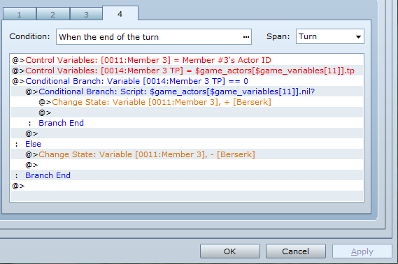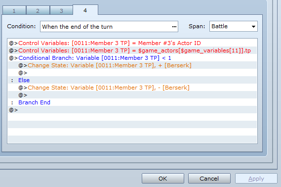I have each page set up like this(excluding the first page, since that's for something else I have setup); One for each actor in the party, but whenever TP gets altered in any way, even though I have the condition set to less than 1(I also tried just putting it equal to 0), it adds the state to all party members, regardless of their current TP. Another problem, is that if a spot in the active battle party is empty, I get this error message: