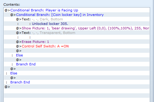 The event I'm trying to set up goes like this: the player unlocks a locker, finds and reads a note, and the chase scene triggers when the picture is erased. I want to make this a one-time event, so the player can go back and look at the picture again without being chased. Here's what I have thus far: