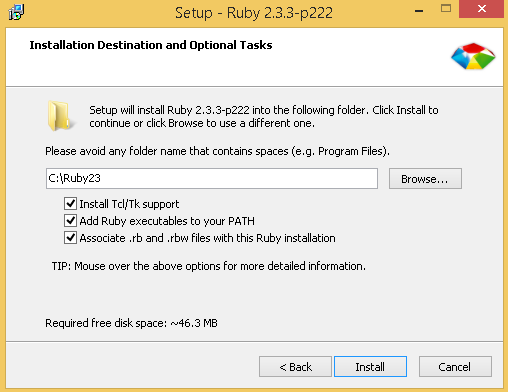 Check these 3 boxes when you install Ruby. I think only one needs to be checked, but I just checked all 3 to be certain.