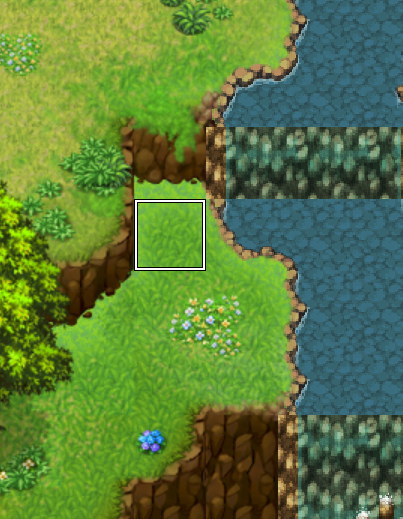 The tile highlighted by the white box is an area the player should be able to roam, as should the tile to the left of it. The problem is, the player should not be able to pass through the side of the cliff to get to the left tile, but with mapping the player's walking area with region, they can. I think what I'm inquiring about is directional passability, which upon my first search, seems to be determined by the properties of tiles themselves. However, because entire map technically a parallax background, the properties of the tiles do not exist on this map.