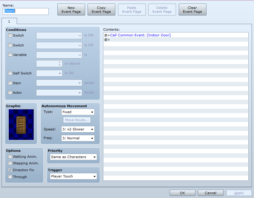I'm trying to make a door event that is accessible when entered from the tiles above and below the door. The door just plays an opening sound effect and its opening animation (no player transfer).
