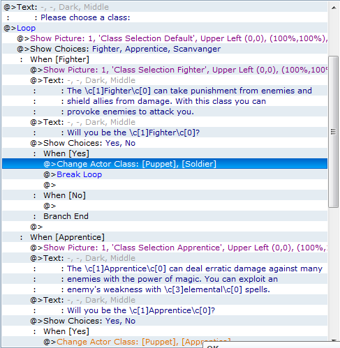 I'm eventing a character creation system. The bulk of this work is done--the problem arises when I want to display to the player suggestions on what classes she or he might do well to choose. Specifically, I want to flag "good" choices in blue or green and "bad" choices in orange or red. I'm looking to get a text box to result in the following coloration: