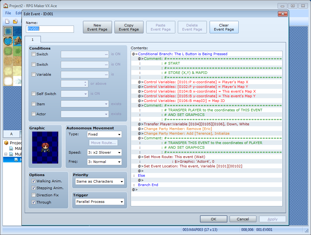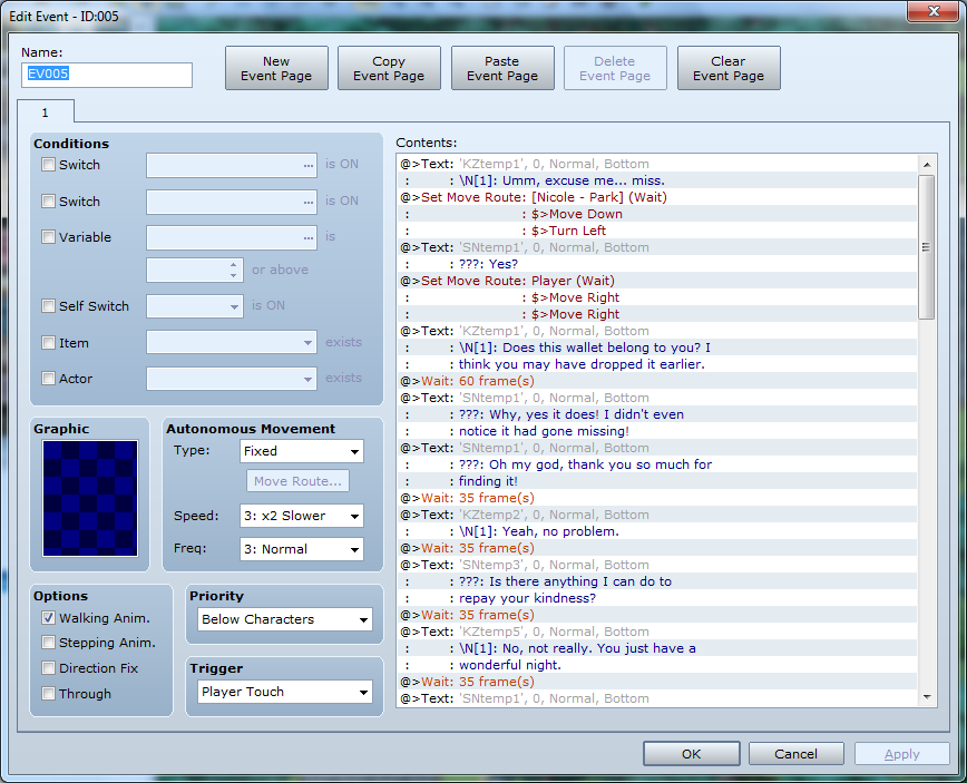 Like I said earlier, the event continues but the event does not move. I want it to move.Have you tried checking "Skip if cannot move" in the Move route(above the Wait for Completion one)?