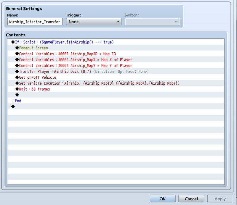 Then, the very first thing you will need to do is construct a Common Event that, when called, will transfer the player to the airship interior.