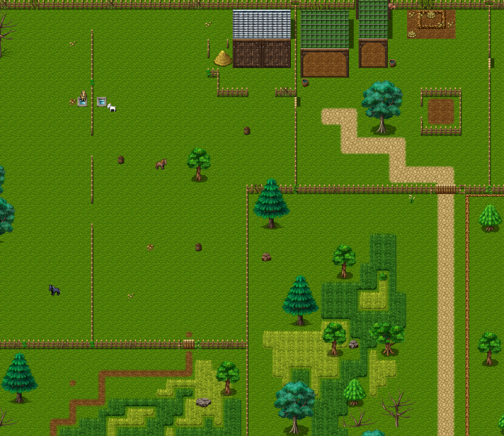 @thatbennyguy: I think that people use the term 'unnatural' incorrectly in regards to rpgmaker. The fact is that in reality that is how the path goes, strait through the woods and then it arcs towards the pasture-gate. The way the fence is set up is relatively how they actually are (I should know, since I installed them.) though using the wooden fences to substitute for horse-wire. The break in the fences that separate the left side of the pasture from the right do exist and have a purpose, at certain times I run an electric fence across those gaps to keep the horses from over-grazing or just wandering to far off. As for the grass, it actually is taller on the wooded side than it is in the pasture (though honestly not as tall as the tall grass tiles, which are pretty unrealistic in almost any situation you would use them in anyway but it's the best that I've got, even unkempt grass doesn't naturally grow up to your waist most of the time, depending on the grass and where it is.) because nothing is generally grazing on the other side of the fence. I get what you are saying from an aesthetic standpoint, sadly rpgmaker cannot capture the elegance and beauty of subtle hills and a sunrise over an open pasture doted by grazing animals and surrounded by a wall of trees that from a top down perspective would be nothing but treetops but can be safely walked through and have trails that wouldn't even be visible from such a perspective.