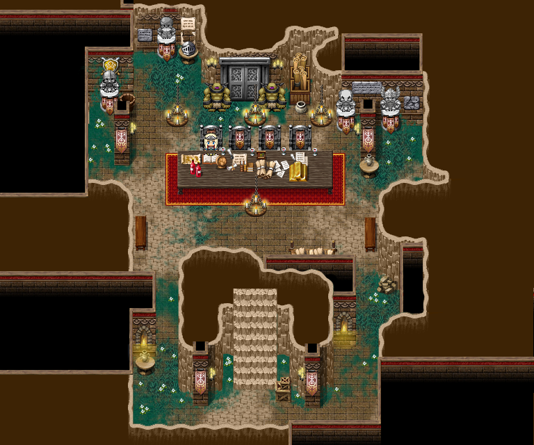 I've incorporated ripped rug auto tiling in a non parallax map, along with some dust overlay tiles to show age and neglect. I've used Tokkuri's fallen pillars\craters edited.