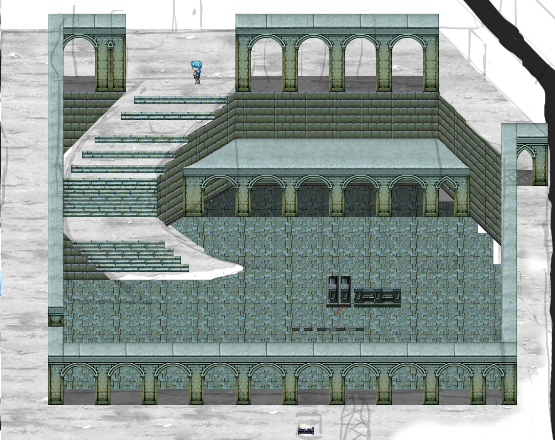 (of course there is also a really big job to do in RM, but we are not talking about graphics creation), in this image you can see I have to do the GFX both in 3D and 2D, the 3D is like a skeleton for the "sprite version" in top-down, I use a Pixel-Painting technic close to Pixel-Art but with "free hand stylus" instead of "dot by dot" with a mouse, 32bits colors with Alpha Channel and modern stuff like that... Always pixel tools, which means always a pencil of maximum 1 pixel square, you get the idea I'm affraid >> titanic struggle.