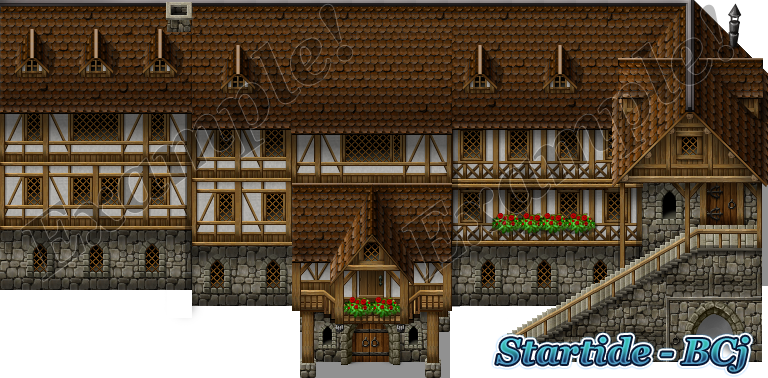 Here is a map I've done using very similar tiles to you. The houses are, typically, one tile apart vertically. There is a broad road for story driven reasons, but even so, it more or less conforms to the proportions I mentioned above. Given the style of tiles you are using - heavily medieval - things should be