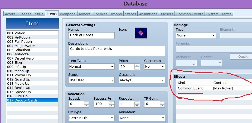 Making the deck of cards a playable inventory item is very easy. You make a common event with your script call. See my screen shots. Make an inventory item for the cards and call on the common event for its effects.