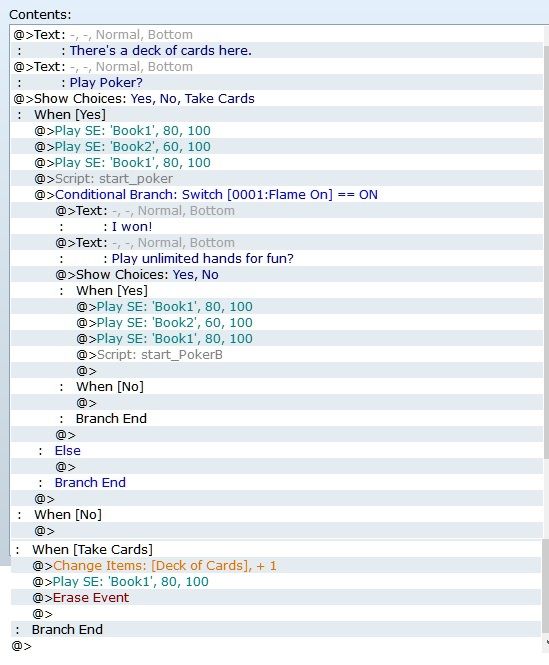 So for this demo, I'm using Duel Coding to have one script turn on a game switch when the player wins a hand of Poker. Then I call on the second script, my Duel Script, and I give the player the option of playing again unlimited for fun. When you are eventing a game, this is a great way to do it. If you have a door or something else you want the player to unlock, have them play poker till they win, the switch gets turned on. Then they have the option of playing again for fun as much as they want to. You don't have to stick with one script. You can make as many duel coding scripts as you want to when working with Ruby and this game engine. The trick is to make sure you renamed everything in the second script so that the game thinks you have a whole new script. it's very easy. And in your event, you call on both when you need them. Remember to make a copy of your picture files and rename it, too. The card pictures here go into Graphics/System. Just see my screenshots.
