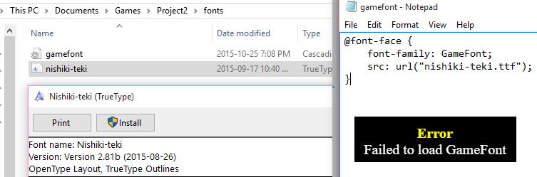 I created another project to try to recreate the issue to make sure I did not accidentally remove another file that the game was looking for. I added the font file to the fonts folder, edited the css page, and only got the loading screen in the brand new project. I am an OS X user for what it is worth. I have deduced that there really does not seem to be an overall solution for this issue.