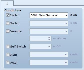 My current project involves a "new game +" feature upon completing the game the first time. I was able to set up the "new game +" command to appear after finishing the game the first time.. and now, I'm trying to get that "new game" to turn on all the switches in it.
