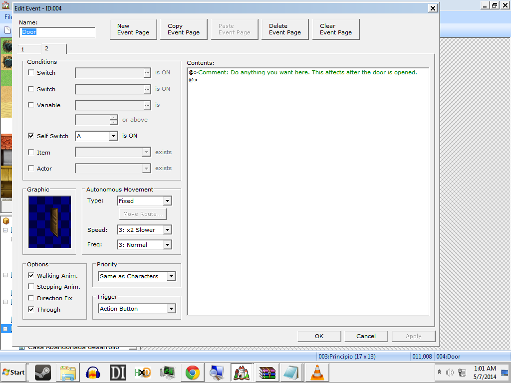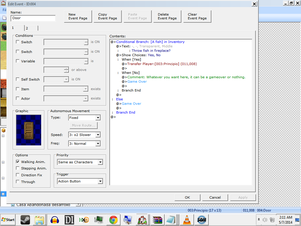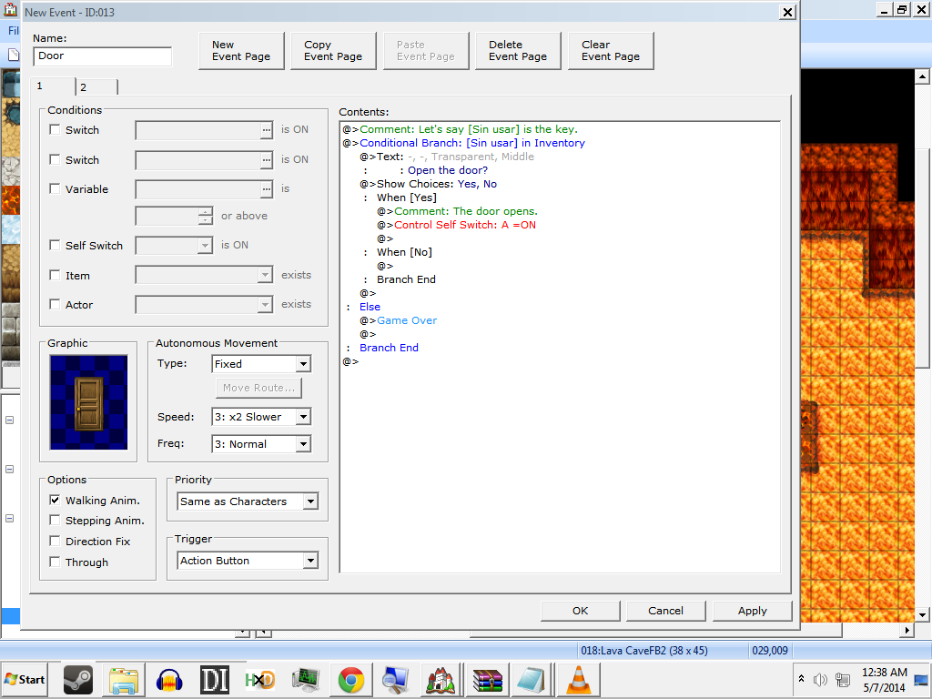 To do it: Make an event with the door closed (or use your door currently), click on the blank space to make an action, on the bottom of the first page of actions, on flow control, click the first action, conditional branch. After that, click on "4" tab, then click on the circle on the side of "items". Get the key item from the items, then click it. (assuming you created the item) then click ok. Then click on the blank space below "Conditional Branch: (item or key name) in Inventory. After that, click on show text in message tab, if you want to add a text if he want to open the door, and write anything you want. Now, click on blank space below and click on "Show choices" below "Show text", leave it like that, and press ok. Below [yes], click on blank space, then click on control self switch on game progression tab, and then click ok. Go down where you can see "Else", and below that, click on blank space, go to tab "3", then click on Game Over, in Scene Control tab. Now, all the way up in the window, click on "New Event Page", then go down on "Conditions" dialog and click on circle aside of "Self Switch", then leave it like that. Now, if you want to add a opened sprite, go down and click to get a picture. Finally to pass the door, click and enable "Through", just below the event picture. What you make in event page 2 is interaction with door after the door is opened.