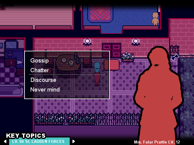 Last Word is an unconventional JRPG. Battle sophisticated guests using words as weapons. Collect topics by gossipping to unlock mysteries. Drink wine. The night is young and no one can leave until the devious Professor Chatters says so! Can Whitty and Seymour overcome the power of the professor's amazing machine? Or will they succumb to the saucy banter of the motley aristocrats around them? Don't hesitate in getting the Last Word.