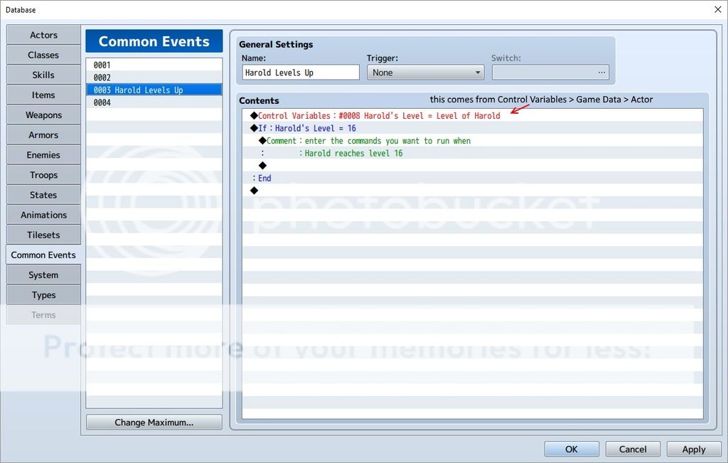 Eu estou fazendo um jogo pokemon, e eu estou usando o plugin '' Level Up Eventos ''. Ativa um evento comum para quando o personagem passa de nível (exemplo 1> 2). Eu coloquei o evento evolução, mas eu só quero para ativar quando o meu pokemon atinge o nível 16