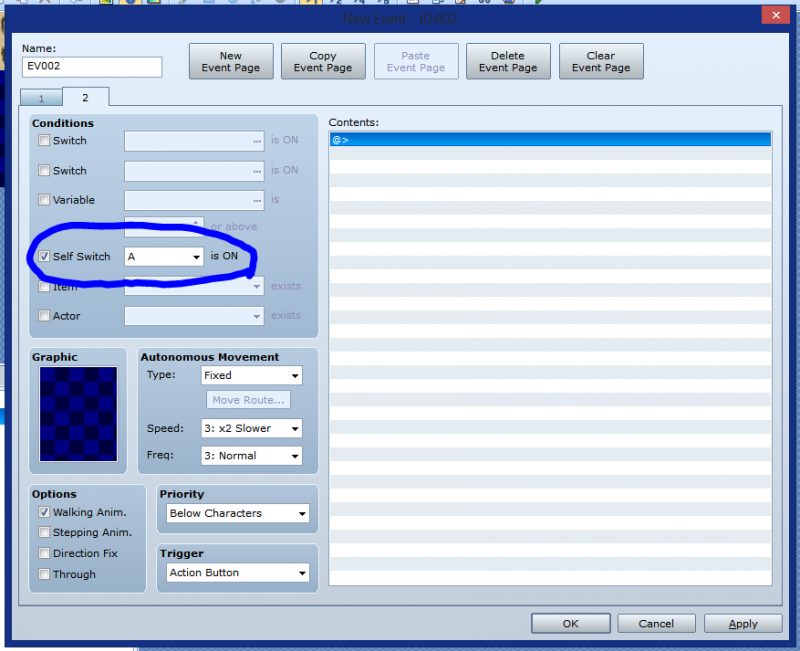 To be clear, this method will get rid of the event immediately after it has run its course. If you want the little girl to dissapear only after the player has found this cat. Then you will have to make some slight changes. Instead of using a self switch, you may use a normal switch (first option under Game Progression). Place the ON Switch within the cat's event, but set up the blank page within the little girl's event the same way. Now once you've interacted with the cat, the girl's event will switch to the blank page and appear to vanish from the map.