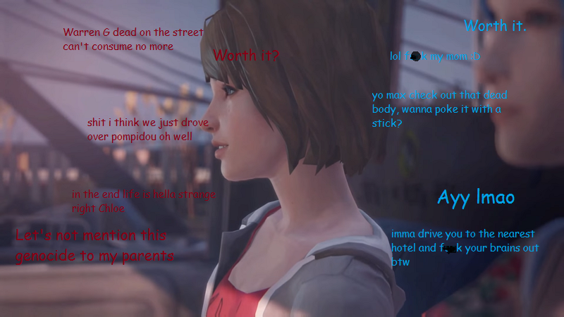 Ok, you decide to save Chloe. The storm destroys the city, they both jump in Chloes car and drive through the city until they leave it. They are finally going on their road trip. Ok, fine. But: There are obviously survivors of that storm. They even pass the two whales diner where Joyce and Warren hid. Did they stop to check on them? Did they stop to check von ANYBODY? No, they just didn't. And that is simply not what Max would have done after all the decisions Max made during the game.