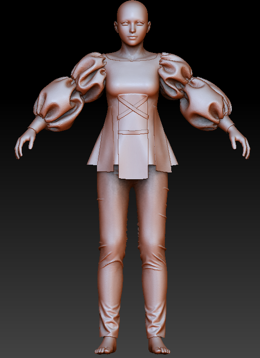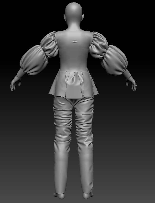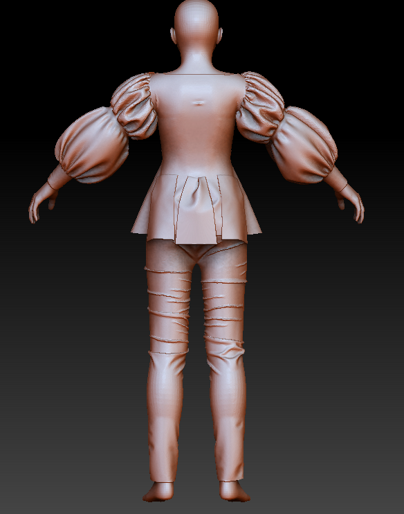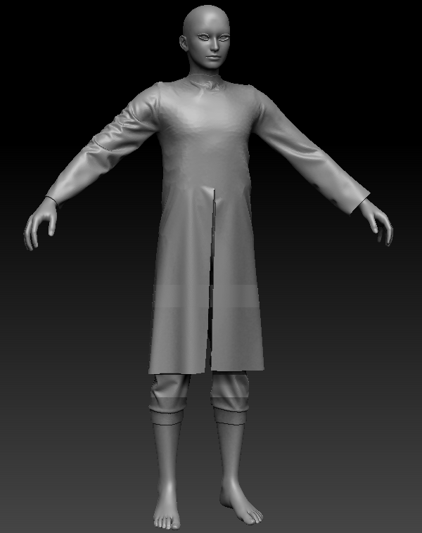 Next, I'll be using the blocked-out body as a base to simulate and sculpt the clothes. I got a start last night but am not yet far enough to show anything interesting.
