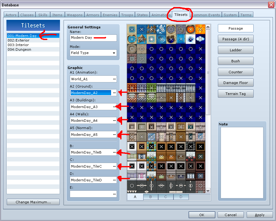 Can someone post a screenshot of the Tileset menu with which graphics should be set to which parts? I've been trying to get it to work for ages.