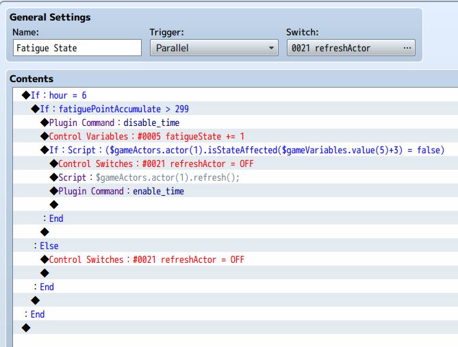 The concept is a farming game where the player can choose to not sleep and doing all-nighters as many as they want... until the debuff/passive state makes them a zombie farmer or some sort. While doing all-nighter the player will accumulate fatigue points. If they accumulate enough, at 6 AM in-game time morning a variable will be increased by one. A state then will be applied based on the value of that variable.