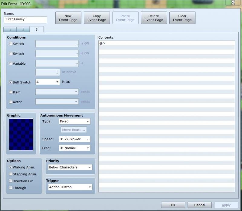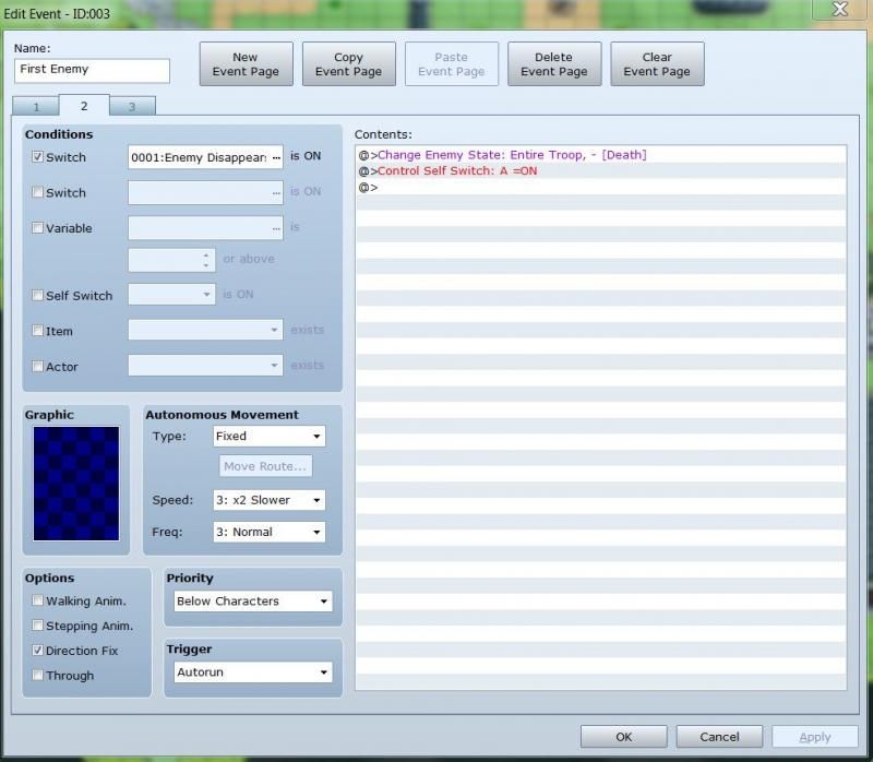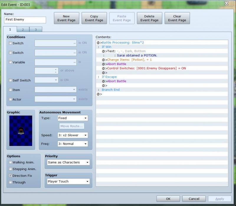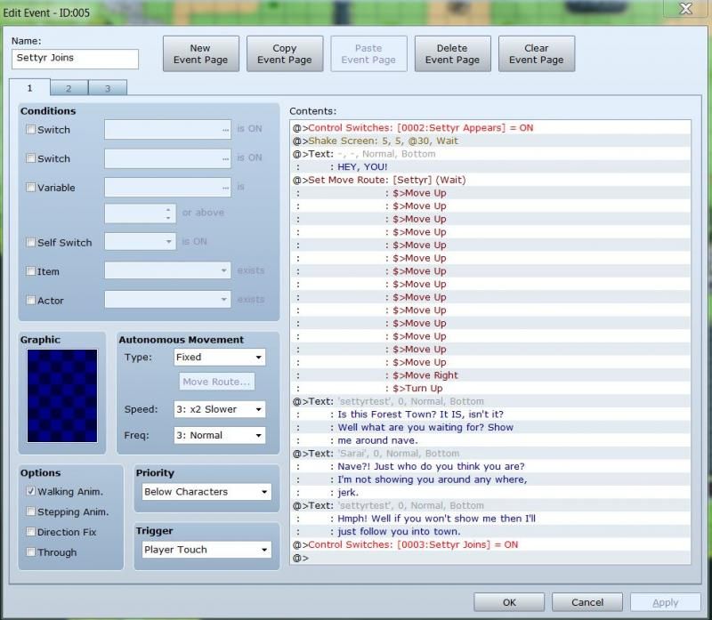 All this worked beautifully just how I wanted it to until the very end, and now my character won't move in play test, no matter how I adjust the switches. I've (not all at once) created extra event switches, used another event to lead into this one, disabled autorun on the final event page, and also used self switches. Nothing seems to work. I had a similar issue with an enemy event I made but I fixed that one by self switch.
