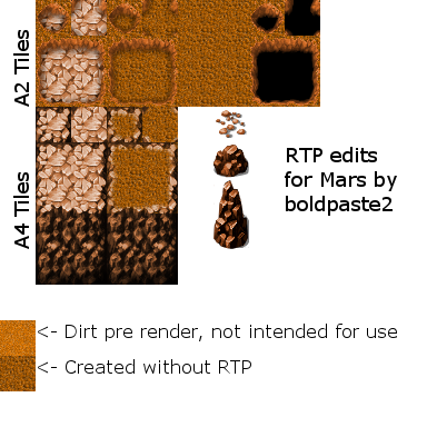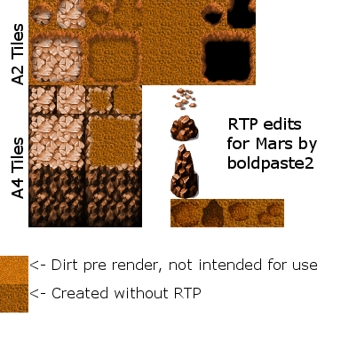 I have been scouring the internet looking for a Field and/or outdoor tileset that might look like Mars or some other planet. I tried to do a recolor of the RTP tiles that were NOT grass, but it came out super bad. So, I come before you, humbled, asking if anyone can either create a reddish/orange Mars like dirt tile, even a recolor, I would be immensely grateful. Even if you know of one, I would be more than pleased! Thanks in advance!