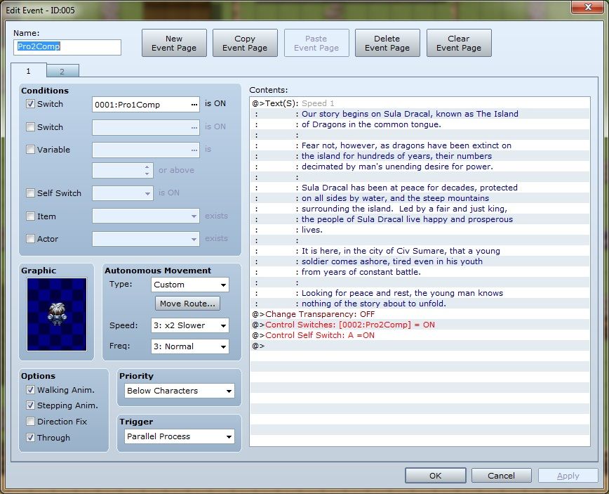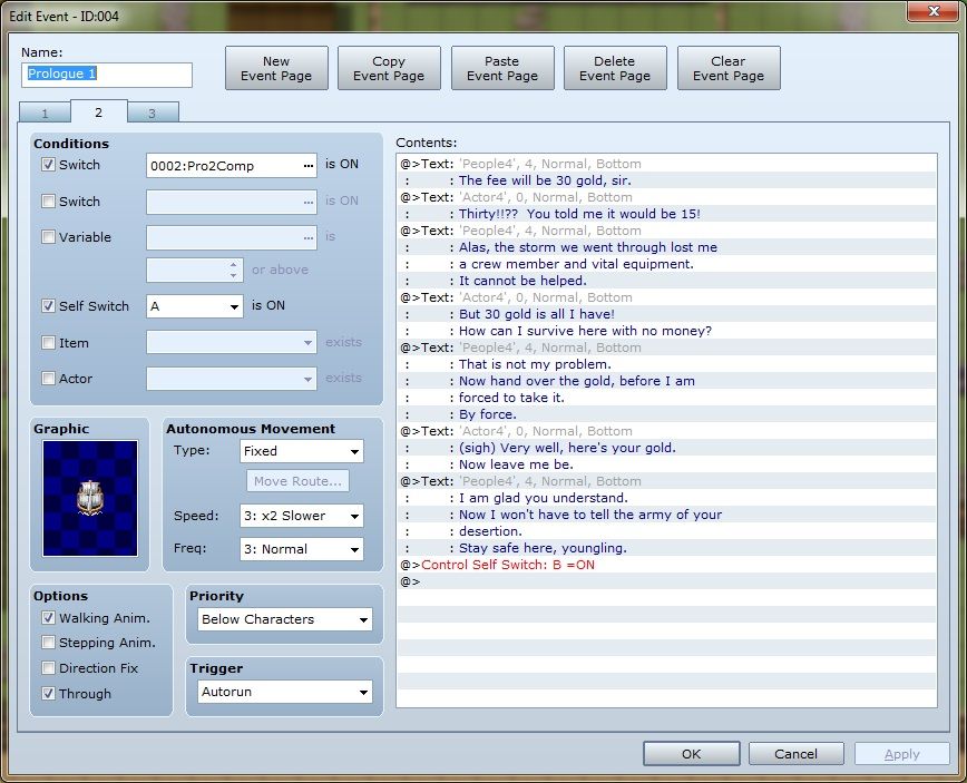 I am trying to create an opening cutscene for my game, and I have been pretty close to successful. Basically what I have is a boat pulling up to a dock with some scrolling text to start the story, followed by a person getting off the boat and walking a step with a little bit more scroling text. I want this to be followed by a short dialogue and then the boat sailing away. It is working great, except for one thing: the scrolling text from the boat pulling up repeats itself after the second set of text, before moving on to the dialgue. Here is what I have right now: