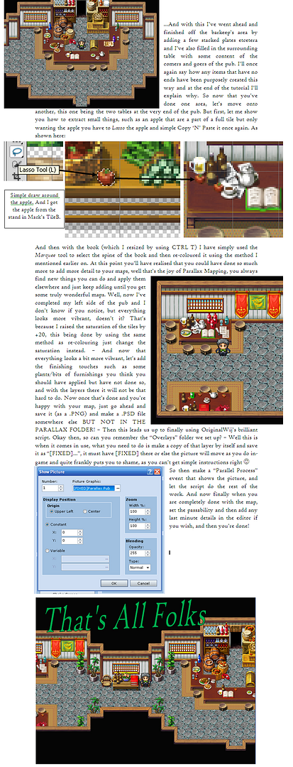 #==============================================================================# Sprite_Picture#==============================================================================class Sprite_Picture < Sprite#--------------------------------------------------------------------------# Update (Overwrite)#--------------------------------------------------------------------------def updatesuperif @picture_name != @picture.name@picture_name = @picture.nameif @picture_name != ""self.bitmap = Cache.picture(@picture_name)endendif @picture_name == ""self.visible = falseelsefixed = @picture_name.include?("[FIXED]") ? true : falseself.visible = trueif @picture.origin == 0self.ox = 0self.oy = 0elseself.ox = self.bitmap.width / 2self.oy = self.bitmap.height / 2endself.x = @picture.xself.y = @picture.y# addedself.x += (self.ox - ($game_map.display_x / 8)) if fixedself.y += (self.oy - ($game_map.display_y / 8)) if fixedself.z = 100 + @picture.numberself.zoom_x = @picture.zoom_x / 100.0self.zoom_y = @picture.zoom_y / 100.0self.opacity = @picture.opacityself.blend_type = @picture.blend_typeself.angle = @picture.angleself.tone = @picture.toneendendend