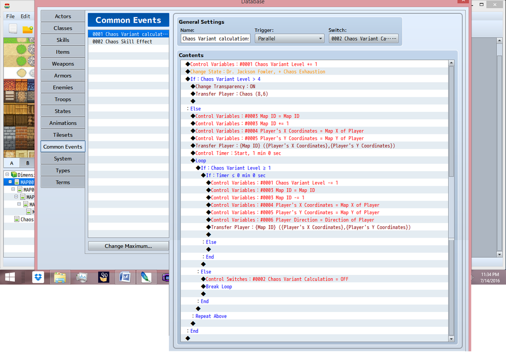 The way it is supposed to work is if that time calling the event has the variable at or below 4 it transfers the player to the appropriate variation of the current map and starts the countdown to when the variable decreases and moves them to the next lower map variation, if it takes it above 4 though it sends them to "Chaos" which is a blank map with a chaotic parallax and a single auto-run event which basically just tells them they have doomed the universe and the game is over before actually going to an actual Game Over.