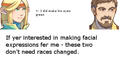These two stay the same (minus the elf’s eyes being made green). These are up here in case someone want’s to take a stab at making me some facial expressions - they‘ll know who I need.