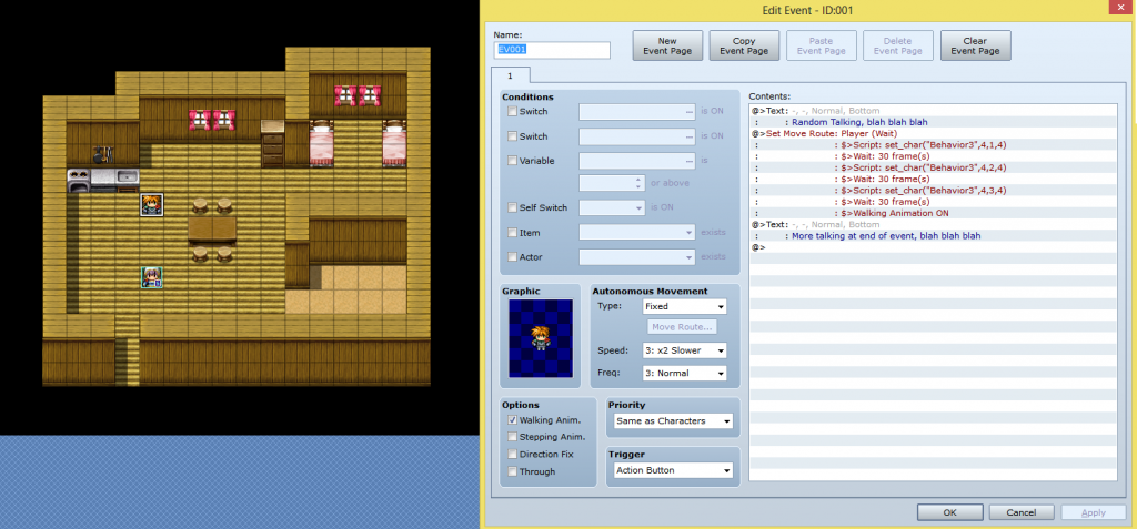 The problem I am having is trying to put behavior animation of my main character during an event, for some reason that is not working and instead either changes the sprite graphic to different character sprites altogether, or makes it so my character is appear idle while moving after the event has ended