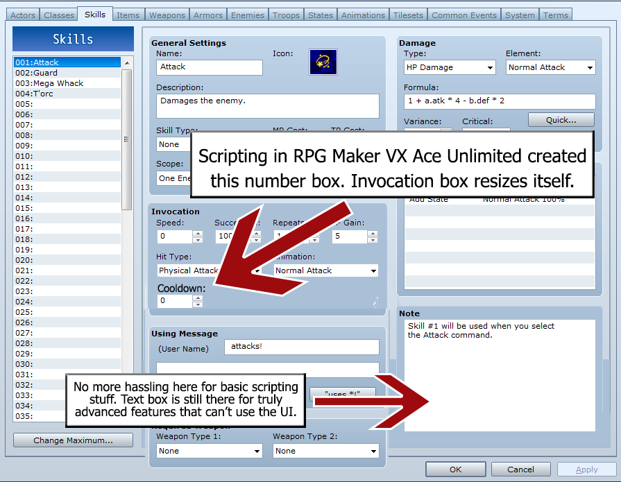 A way to cast certain skills or items on both the enemies and the party. For that matter, better scopes. I should be able to create a whip that will hit all enemy types and a boomerang that will hit the entire troop. For that to work, we should be able to categorize enemies by type (ie., none if no type, undead for ghosts and zombies, unholy for witches and demons, etc) and have the option of giving up to 2 or 3 types for each enemy. We could even set up resistance and weaknesses for monsters based upon a specific type.