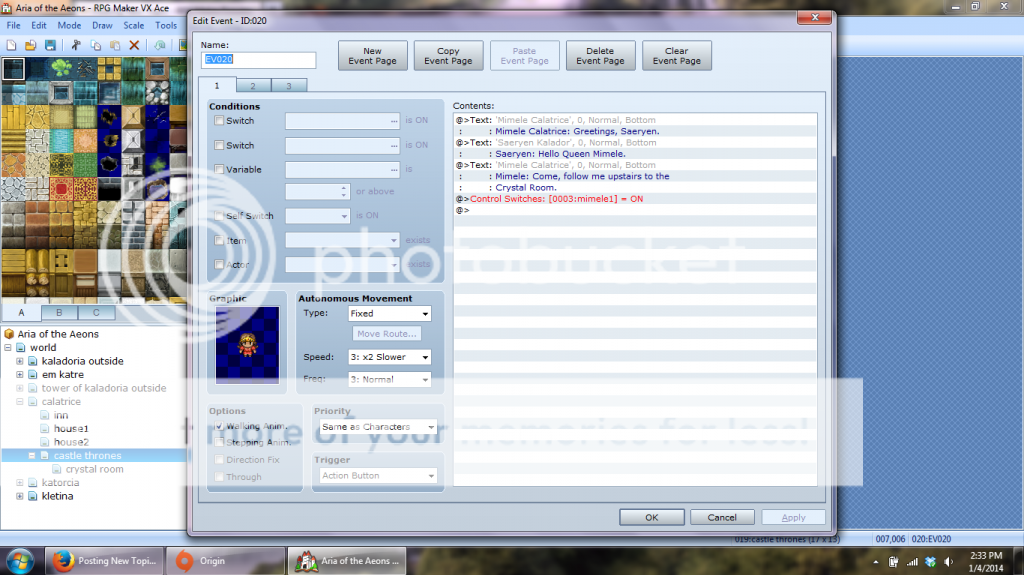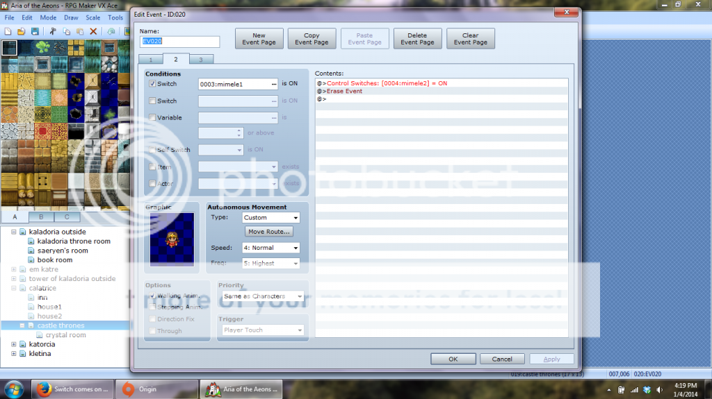 Put the move route command (as the command, not as autonomous movement like your current second page) on the first page, after the text commands and a control self-switch at the end of the first page after the move command, then delete the current second page and condition the current third page (which will then be the new second page) on the self-switch, not on general switches.