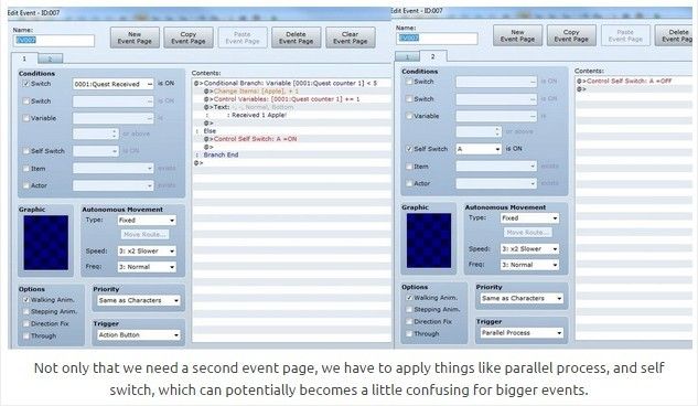 The RPG maker VX Ace event page comes with limited amount of conditions that must be met in order for the event to spawn on the map. These conditions are limited to switch, variable, self switch, item and actor. What if we want to use a custom condition that comes with a script, or what if we want to check if the party has x amount of gold before the event will spawn? We will have to use additional event page that will be activated using a self-switch from a parallel process page. This can potentially be confusing for users.