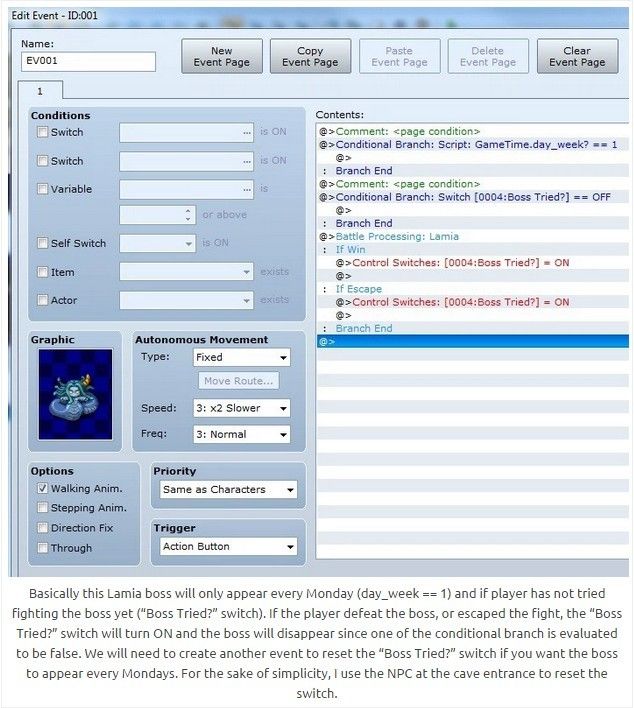 Anyone who has played the Pokemon Crystal on GBA back then would probably remember that cave where we can find a Lapras every Friday. The question is, how can we create such event on RPGmaker easily without having to use (potentially complex) parallel processing, self switches, and/or some sort of variables/switches to check/keep track of certain condition(s)? One way to achieve this easily is to use this <page condition> script.