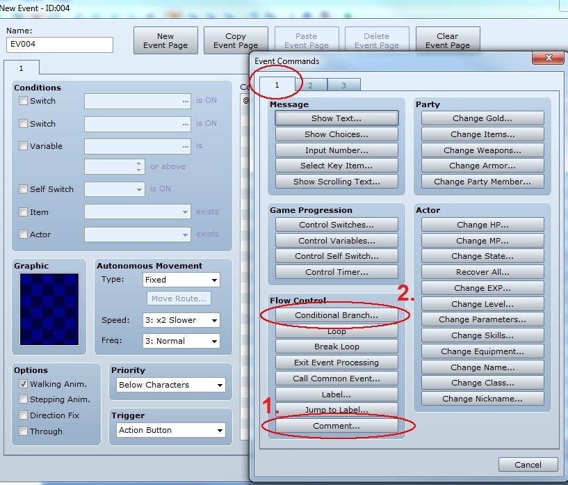 <page condition>Then create a conditional branch event right after the comment. The conditional branch will be converted into a page condition required in order for the event to spawn. If you are unsure where to find "Comment" or "Conditional Branch" in the event creation page, please refer to the following image: