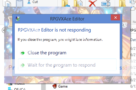 If you think that would help the simple thing to do would be to rename you project folder of the last project you ran, mine is located in documents/RPGVXAce.Keep those tips coming. I appreciate the help, but it appears the program is still crashing before it even opens. If only there were a way to open the program without opening the project, then I think I can at least get the program to run.