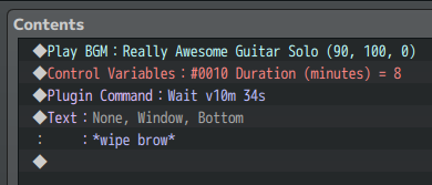 This plugin allows you to call Wait events using minutes, seconds, variables, and more. Useful when you need to time waits to music, sound effects, or other units of time that make converting -- and reading -- frames inconvenient.