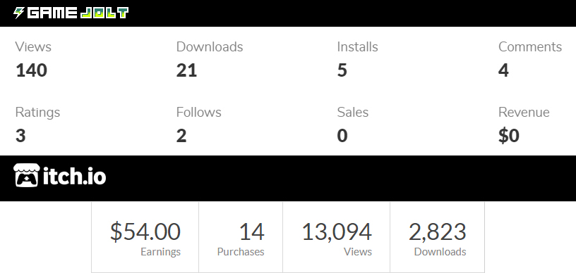 Second of all, as mentioned, there's literally no way of getting any views or visibility in there. People say there's tons of games and you can get burried in Steam but Steam at least allows you to have update visibility rounds, you can partake in sales, visibility and much more. There's none of that in Game Jolt, the site doesn't provide any sort of visiblity tools and this translates to far less clicks. You'll be in literal sea of games and only way to get more recognition is to spend a lot of money in marketing, to maybe get a fraction of what you'd get at Steam for 100$ Steam Direct cost.